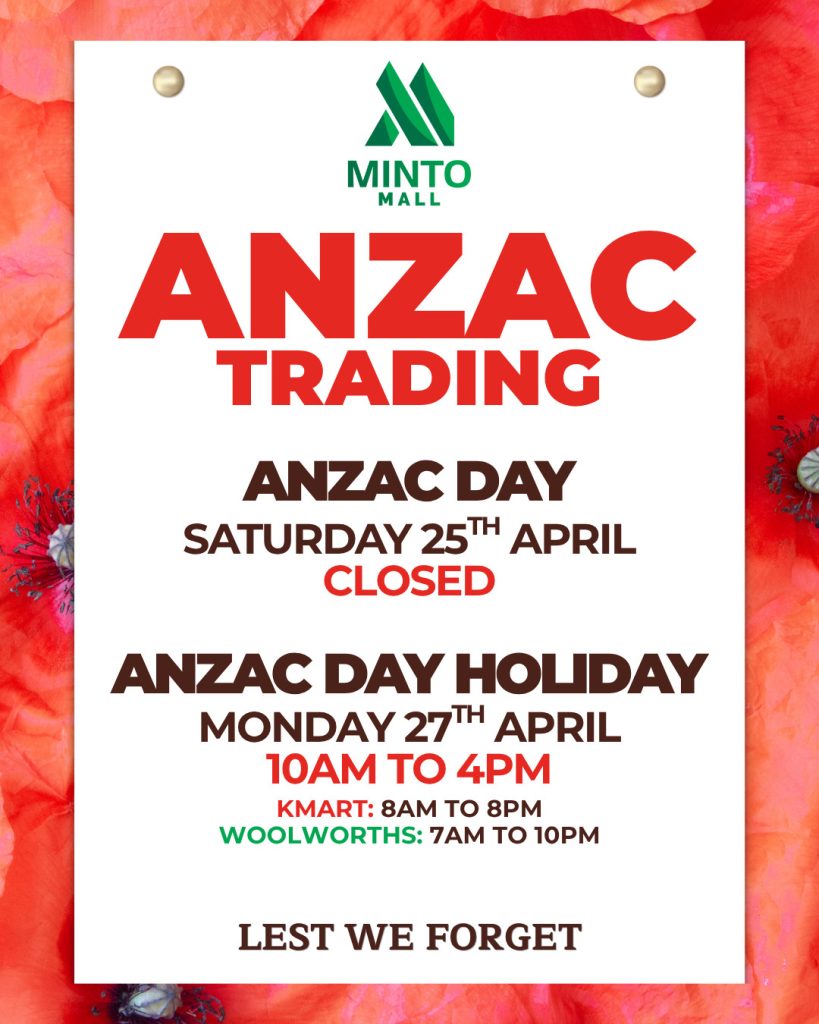 In observance of this solemn occasion, Minto Mall will be adjusting our trading hours, both on ANZAC Day (Saturday April 25th), and the ANZAC Day Holiday (Monday April 27th)